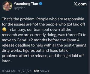 Mange FAIR-forskere, inkludert FAIR Research Scientist Director Yuandong Tian, ble berørt. Jeg tror Yann Lecun vil forlate snart.
