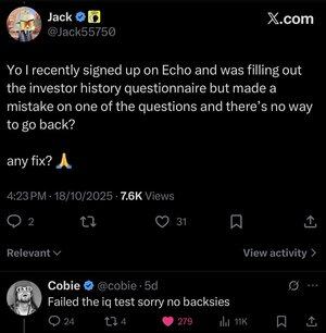 Hei @cobie jeg vet at du sa "Jeg mislyktes i IQ-testen", men nå som @coinbase har skaffet seg Echo, kan du tilbakestille kontoen min eller koble fra twitteren min til e-posten Ønsker å delta i MegaETH-salget, men KAN for øyeblikket ikke fordi du ikke kan gå tilbake på investorspørreskjemaet