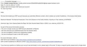 Sensurvarsel: Jeg publiserte en bok om Ghislaine Maxwell-rettssaken, og en annen om Kevin Spaceys rettssak - i kveld fikk jeg en e-post fra Amazons KDP som sa at de er upassende, og der blir alle bøkene mine tatt ned, inkludert om Sudan, SBF, Eric Adams