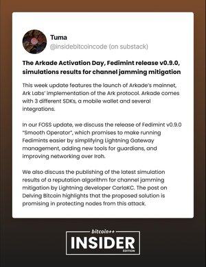 @arkade_os Activation Day, @fedimint utgivelse v0.9.0 og simuleringsresultater for reduksjon av kanaljamming i denne ukens oppdatering fra @btcinsider__