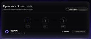 Du kan ikke se hele $MON airdrop i dag. Din $MON airdrop-tildeling vil bli levert gjennom Monad-bokser. Du må avsløre boksene for de neste tre dagene for å se hele airdrop-tildelingen din.