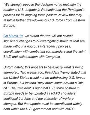 I et sjeldent trekk kritiserer de øverste republikanske lovgiverne i Senatet og Representantenes hus' komitéer for de væpnede tjenester forsvarsminister Hegseths planer om å kutte antallet amerikanske tropper som er tilstede på Europas østlige flanke (ved ikke å erstatte en roterende enhet i Romania).