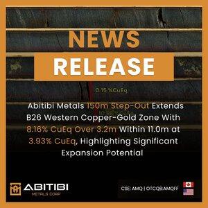 NYHETSMELDING: Abitibi Metals 150m Step-Out utvider B26 Western Copper-Gold Zone med 8,16 % CuEq over 3,2 m innen 11,0 m ved 3,93 % CuEq Fremhever betydelig ekspansjonspotensial  Lese: CSE: $AMQ. Til 🇨🇦 OTCQB: $AMQFF 🇺🇸