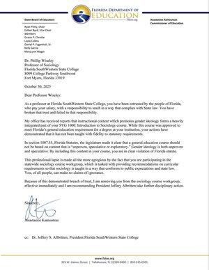 I dag tok jeg umiddelbare skritt mot en professor ved Florida SouthWestern State College ved å fjerne ham fra den statlige arbeidsgruppen for sosiologikurs etter rapporter bekreftet at han brukte instruksjonsmateriell som fremmet kjønnsideologi, et direkte brudd på statens lover. Jeg anbefaler også høyskolepresidenten å iverksette ytterligere disiplinære tiltak for å sikre at dette aldri skjer igjen.