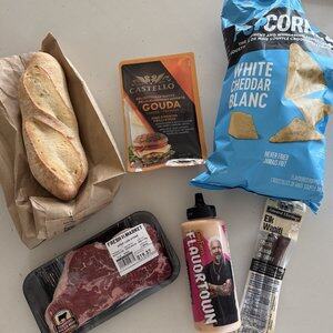 Biff, ost i skiver, Guy Fieri Flavortown-saus, chips, elg jerky og et brød