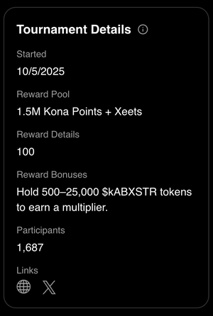 Den offisielle Kona @xeetdotai-turneringen har nå en belønningsbonus på opptil 2x basert på mengden $kABXSTR du har på @AbstractChain.
