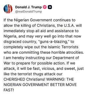 🚨 TRUMP: «Hvis den nigerianske regjeringen fortsetter å tillate drap på kristne, vil USA umiddelbart stoppe all hjelp og assistanse til Nigeria, og kan meget vel gå inn i det nå vanærede landet, «våpen-a-blazing», for fullstendig å utslette de islamske terroristene ...»