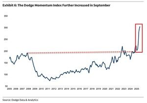 AI-konstruksjonsboomen: Dodge Momentum-indeksen steg +60 % på årsbasis i september, til det høyeste som er registrert. Denne indeksen fungerer som en ledende indikator for ikke-boligbygging, og sporer prosjekter som vanligvis går fra planlegging til banebrytende innen 9–12 måneder. Hoppet ble ledet av en økning på +75 % på årsbasis i institusjonelle prosjekter som helsevesen og offentlige bygninger, og et hopp på +53 % i kommersiell aktivitet drevet av datasentre og detaljhandel. Indeksen steg også +3 % på månedsbasis i september, og forlenget en kraftig oppadgående trend etter +5 % i august og +21 % i juli. Med andre ord, økningen i AI-drevne datasenterprosjekter er satt til å oversettes til en kraftig byggeboom over hele USA i 2026. AIs innvirkning på realøkonomien akselererer.