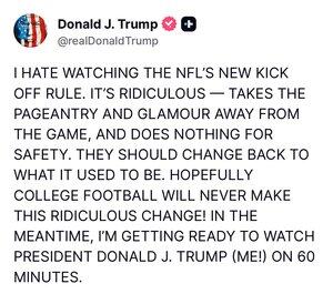 «TAR POMPØSITETEN OG GLAMOUREN BORT FRA SPILLET, OG GJØR INGENTING FOR SIKKERHETEN. DE BØR ENDRE TILBAKE TIL HVA DET PLEIDE Å VÆRE. FORHÅPENTLIGVIS VIL COLLEGE-FOTBALL ALDRI GJØRE DENNE LATTERLIGE ENDRINGEN! I MELLOMTIDEN GJØR JEG MEG KLAR TIL Å SE PRESIDENT DONALD J. TRUMP (MEG!) PÅ 60 MINUTTER.»