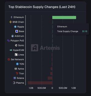 ethereum hadde $1 100 000 000 i stablecoin-tilstrømning de siste 24 timene.