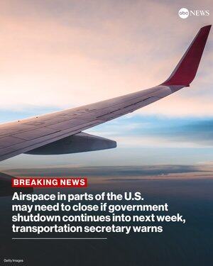 BREAKING: Transportdepartementet kan bli tvunget til å stenge luftrommet i visse deler av landet hvis regjeringens nedstengning fortsetter inn i neste uke, sa transportminister Sean Duffy tirsdag.