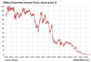 Inntektsfond for kontoreiendommer Fra $110 til $.17. Begjært kapittel 11 konkurs. Eier 122 kontoreiendommer med til sammen 17,1 millioner SF. Gjeld på 2,42 milliarder dollar består av: to boliglån på totalt 177 millioner dollar (UBS og JPM), sikret av spesifikke eiendommer; og åtte seddelutstedelser på til sammen 2,24 milliarder dollar, noen sikret, andre usikret. Den amerikanske regjeringen er den største leietakeren på eiendommene. Beleggsprosenten på tvers av alle eiendommer har falt til 77 %. -Av Wolf Richter for WOLF STREET. #CommercialRealEstate