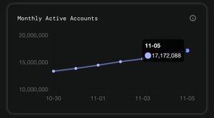 17,17 millioner månedlige aktive adresser (+28,5 % på en uke). Skalering raskt!