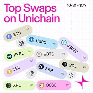 Disse representerer de beste tokenene som byttes etter volum på Uniswap-protokollen på Unichain mellom 10/31 og 11/7.