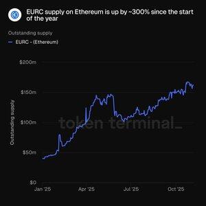 🇪🇺⛓️ @circle EURC-forsyning på @ethereum har økt med ~300 % siden starten av året.