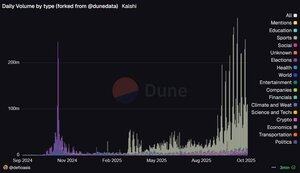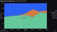 Underholdning → Valgtopp (nov '24) → Nedgang etter valget → 2025 repricing og institusjonalisering. Ukentlig volum tok seg opp fra < 0,5 milliarder dollar til > 2 milliarder dollar.