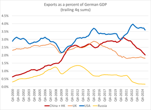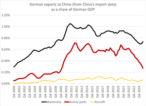Tyskland var selvfølgelig den eneste store økonomien som virkelig var avhengig av eksport til Kina fra 2008 til 2018 – så den er rett og slett mer utsatt for det andre Kina-sjokket. Eksporten til Kina og HK er ned et helt p. punkt av tysk BNP