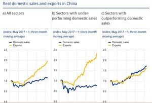 Og ECB finner at Kinas eksport overgår den innenlandske økonomien over hele linja - men spesielt i sektorer der den innenlandske siden av den kinesiske økonomien er svak ...