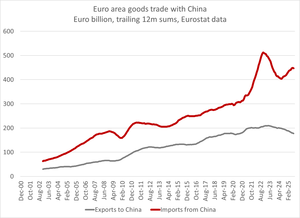 Det korresponderer med en svingning i euroområdets handel med Kina – fallende eksport (absolutt og i forhold til EAs BNP), et økende bilateralt underskudd som korresponderer med et fallende globalt overskudd når irske skatteforvrengninger fjernes