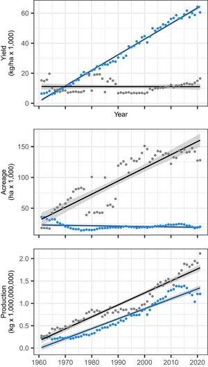 Jordbærproduksjonen har vokst med lignende hastigheter i Europa (grå) og Amerika (blå).