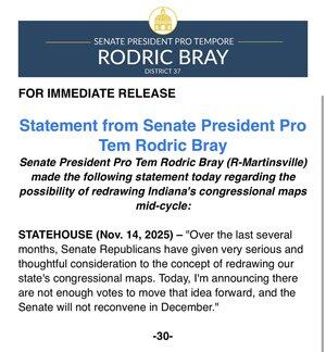 Indiana-republikanerne mangler stemmer til å tegne kongresskartene på nytt og vil ikke samles igjen under spesialsesjonen innkalt av guvernør Mike Braun.