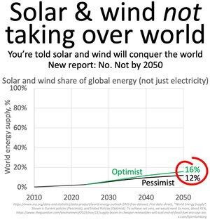 Klimamyte: Sol og vind tar over verden Nei Ny rapport fra Det internasjonale energibyrået viser at sol og vind vil dekke 12-16 % av den globale energien innen 2050 Likevel hevder The Guardian at ny rapport viser fornybar «overgang 'uunngåelig', til tross for Trump»