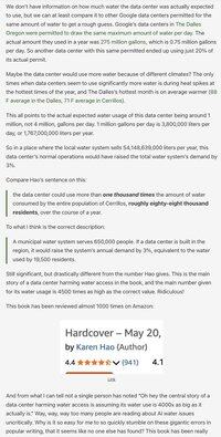 Dette er den mest massive faktafeilen i en stor bok jeg noen gang personlig har lagt merke til på egen hånd, og jeg tror jeg er den første personen som legger merke til det? Empire of AI hevder at et datasenter bruker 1000 ganger så mye vann som en by. I virkeligheten er det 22 % av byens vann.