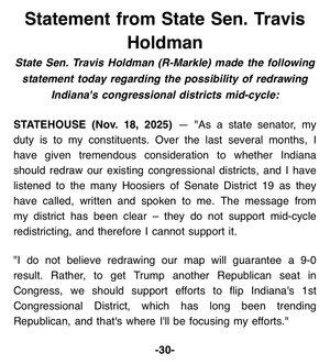 Ny: Indiana-senator og republikaner Travis Holdman, leder for flertallsgruppen, kunngjorde at han er nei til omfordeling.
