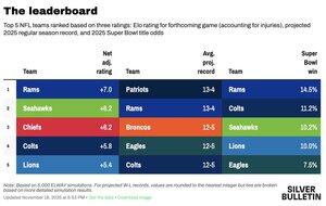 ELWAY-oppdatering! Rams har nå en ganske klar ledelse i QB- og skadejusterte vurderinger. ELWAY liker fortsatt Chiefs, som i motsetning til i fjor er bedre enn deres rekord, men med 5-5 er de nede i 67 % sjanse for å nå sluttspillet.