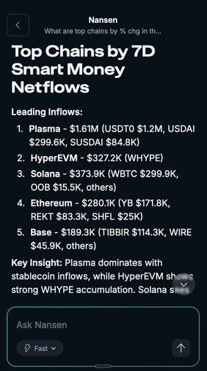 Hva er de største kjedene etter Smart Money netflows de siste 7 dagene? 1️⃣ @Plasma - 1,61 millioner dollar 2️⃣ @Solana - 373,9 000 dollar 3️⃣ HyperEVM - 327,2 000 dollar 4️⃣ @Ethereum - $280,1K 5️⃣ @Base - 189,3 000 dollar Du kan kalle det støy. Smart Money kaller det overbevisning.
