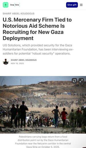 UG Solutions, den amerikanske militære underleverandøren som voktet GHFs hjelpeplasser i Gaza, øker rekrutteringen til 12–15 nye distribusjonsknutepunkter som kan åpne under Trumps fredsstyre, rapporterer @sharifkouddous. En tidligere offiser i hæren som var på intervju for en stilling, fortalte Drop Site at utplasseringer kunne begynne i desember, med vakter som betaler opptil 1 000 dollar om dagen. UG Solutions fortalte Drop Site at de forbereder seg på flere scenarier – alt fra en rådgivende rolle til en «robust sikkerhetstilstedeværelse».