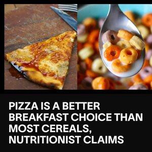 "Du vil kanskje bli overrasket over å finne ut at et gjennomsnittlig pizzastykke og en bolle frokostblanding med helmelk inneholder nesten like mange kalorier," sier Chelsey Amer, MS, RDN, CDN. "Men pizza har mye større proteinkraft."