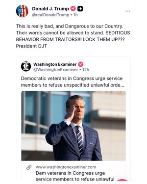 President Trump som svar på demokratiske veteraner i Kongressen som oppfordret tjenestemedlemmer til å nekte uspesifiserte «ulovlige ordre»