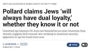 Fullstendig uforsvarlig. Pollard har uttalt seg offentlig siden han kom tilbake til Israel, og hevdet at det er en moralsk plikt å spionere på USA. Dette er fra Times of Israel, så alle kan spare meg for falske anklager om antisemittisme. Dette er Pollards ord.