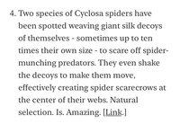 To arter av edderkopper har blitt observert som vever gigantiske silkeknodier av seg selv – noen ganger opptil ti ganger sin egen størrelse – for å skremme bort rovdyr. De rister til og med lokkebøkene for å få dem til å bevege seg, og skaper effektivt edderkoppfugleskremsel i midten av nettet sitt.