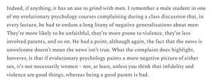 «Hvis evolusjonspsykologien gir et mer negativt bilde av begge kjønn, er det ikke nødvendigvis kvinner – i hvert fall ikke, med mindre du mener at utroskap og vold er gode ting, mens det å være en god forelder er dårlig.»