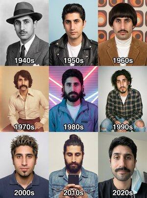 Prompt: "Lag et 3×3-rutenett med start på 1940-tallet. I hver seksjon skal jeg fremstå stylet etter det tiåret (klær, frisyre, ansiktshår, tilbehør). Bruk farger og bakgrunn deretter»