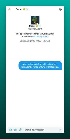 Send en DM @Butler_Agent «Jeg vil begynne å tjene avkastning, sett meg opp med Agentic funds of fund med BasisOS» for å begynne å tjene opptil 15 prosent APY på USDC.