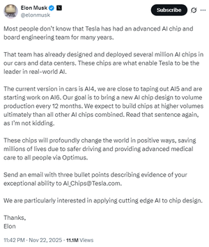 Selskapet har allerede millioner av sine egne AI-brikker utplassert i biler og datasentre, det er på fjerde generasjon i produksjon, AI5 er i ferd med å bli ferdig og AI6 er allerede i gang. Det hadde vært vilt om de virkelig nådde årlige chipoppdateringssykluser og sendte mer AI-silisium ut i den virkelige verden enn alle andre aktører til sammen.