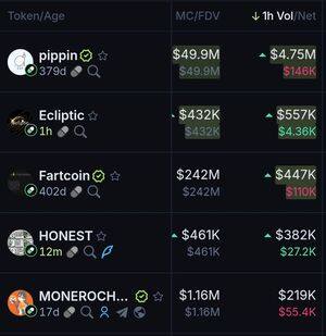 Topp Pumpfun-mynter for den siste 1 timen basert på volum: $Pippin $Ecliptic $Fartcoin $Honest $Monerochan 🤖: