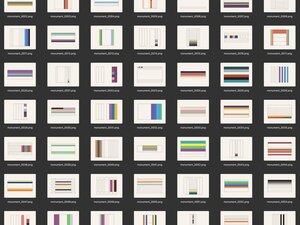 Hver tegning hyller ett av prosjektene i den kuraterte samlingen, destillerer dens fargeidentitet og tester den mot en lineær ramme. Algoritmen gjenskaper også hvordan jeg jobber for hånd ved å bruke blyanter og linjaler, og metodisk blande farger fra et kjernesett med maling.