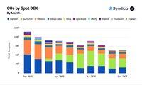 Spot-DEX-er tok en større andel, fra 51 % til 62 %, mens aggregatorene falt fra 37 % til 21 %.
