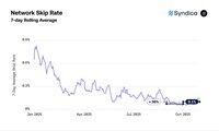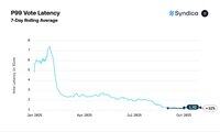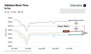 Agave-validatorer slo målet på 400 ms med 6 % i oktober. Frankendancer-validatorene kjørte 47 ms tregere enn Agave og 6 % over målet.