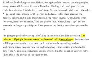 Enig med Elon i at langsiktig sammensmelting mellom menneske og AI er det eneste reelle svaret, ellers blir mennesker bare irrelevante...