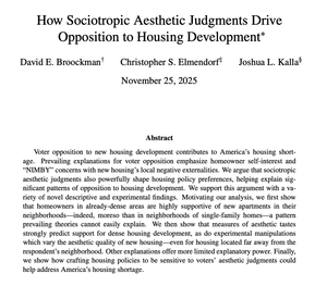 NYTT PAPIR med @CSElmendorf & @j_kalla: En undervurdert grunn til at velgere er imot tette nye boliger, spesielt i mindre tettbygde nabolag: de synes det ser stygt ut og ønsker å forhindre det, selv i andre nabolag. Noe av det vi tror er NIMBYisme, er kanskje ikke det! 🧵