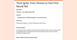 Torch Ignite kommer til Patra, Hellas 28. november 2025 for en tre timers praktisk introduksjon til PyTorch. Denne workshopen er laget for nybegynnere som ønsker praktisk erfaring med tensorer, autograd, optimalisering og trening av et første nevralt nettverk.