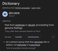 Det er interessant for meg at her, i den andre definisjonen, innebærer oppriktighet å ikke være hyklersk. Det virker som man kan være både oppriktig og hyklersk samtidig, fordi hykleri ofte er et resultat av irrasjonalitet (utilsiktet) snarere enn bedrag (intensjonelt).