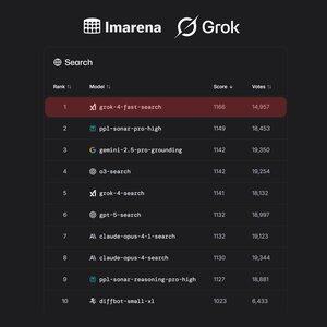 BREAKING: Grok 4 Fast er fortsatt rangert som #1 på LMArenas Search Leaderboard.