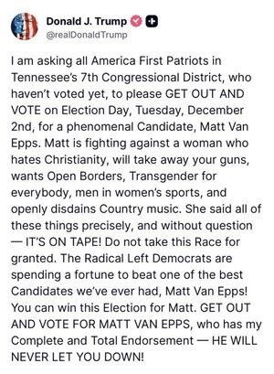 Trump kommer med en ny appell til republikanerne om å møte opp i #TN07 spesialvalg til Representantenes hus.