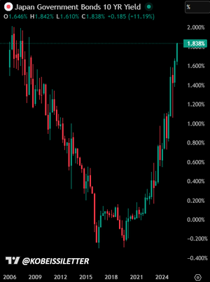 NYTT: Japans 10-årige statsobligasjonsrente stiger til 1,84 %, det høyeste nivået siden april 2008.